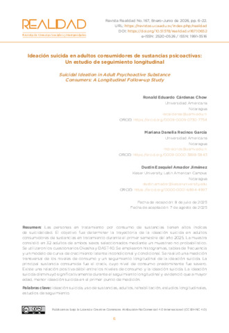| Title: | Ideación suicida en adultos consumidores de sustancias psicoactivas: Un estudio de seguimiento longitudinal |